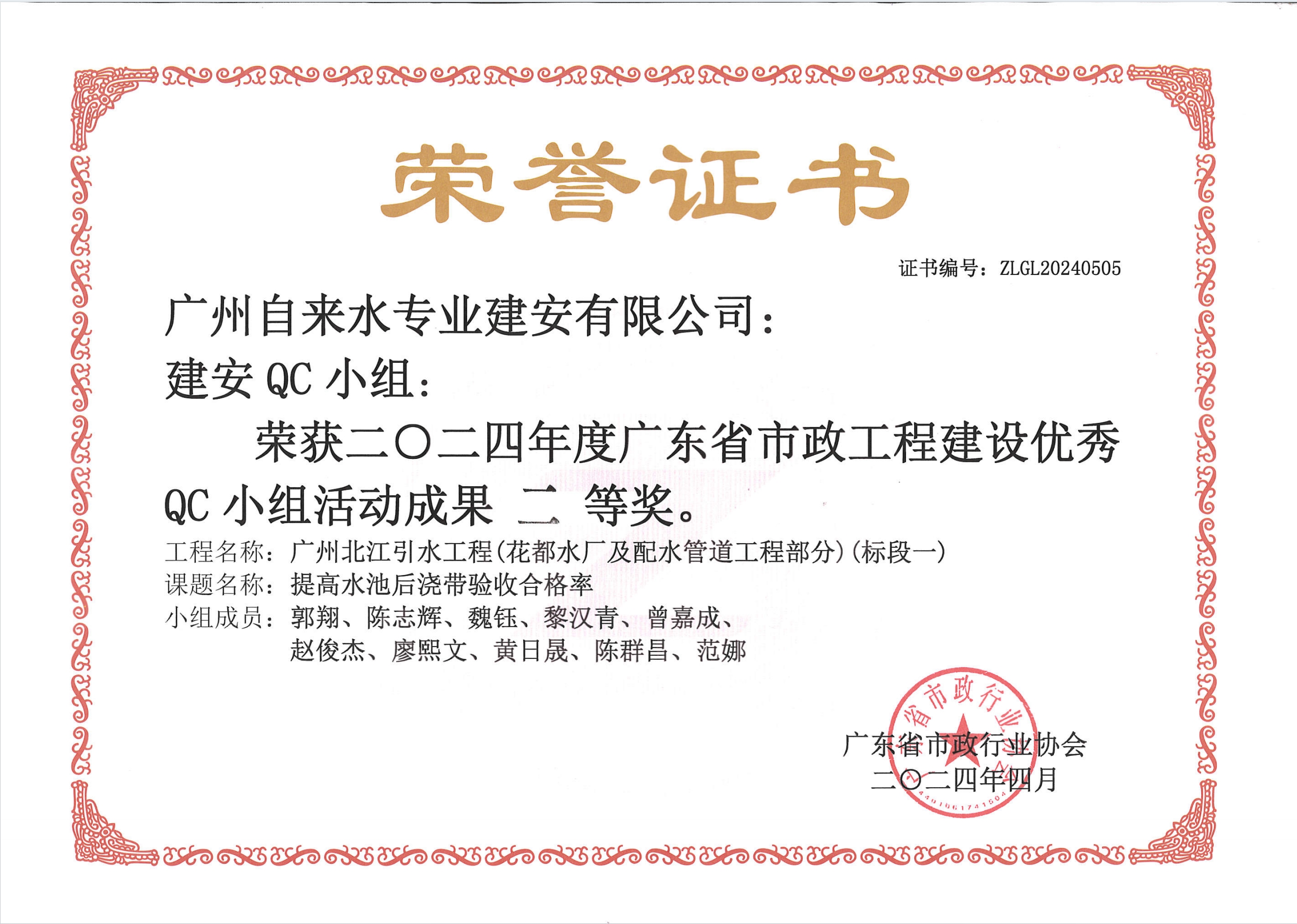 二〇二四年度广东省市政工程建设优秀QC 小组活动成果二等奖