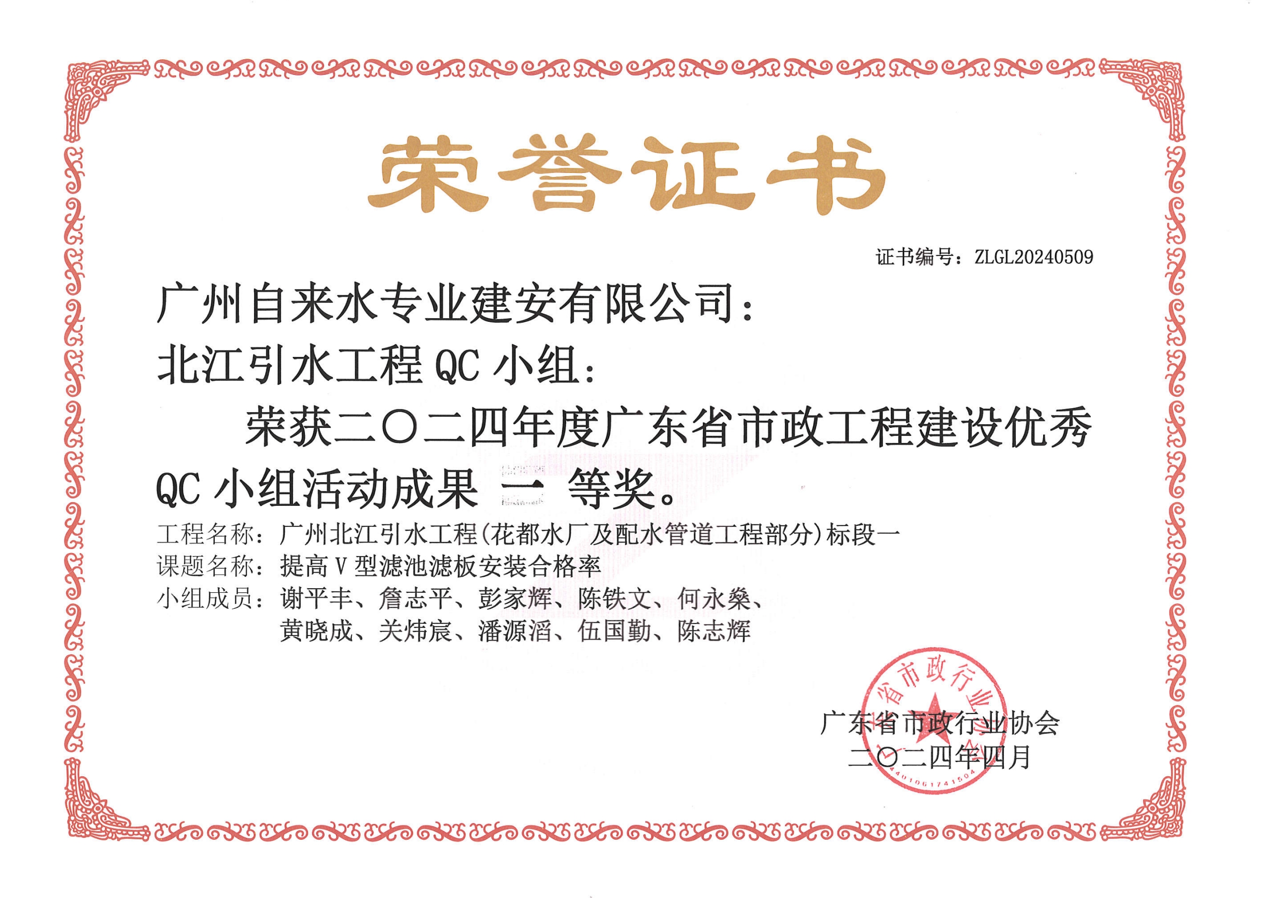 二〇二四年度广东省市政工程建设优秀QC 小组活动成果一等奖