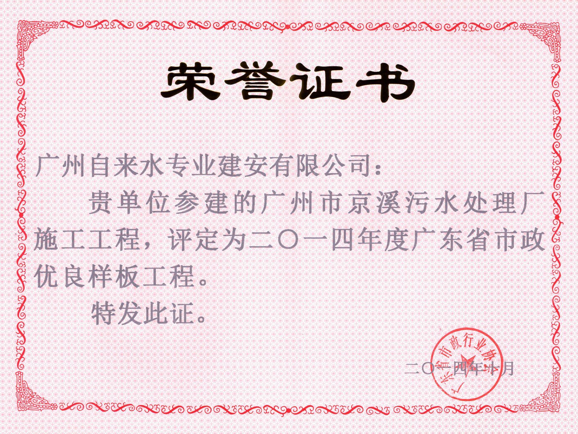 2014年度广东省市政优良样板工程-京溪污水处理厂