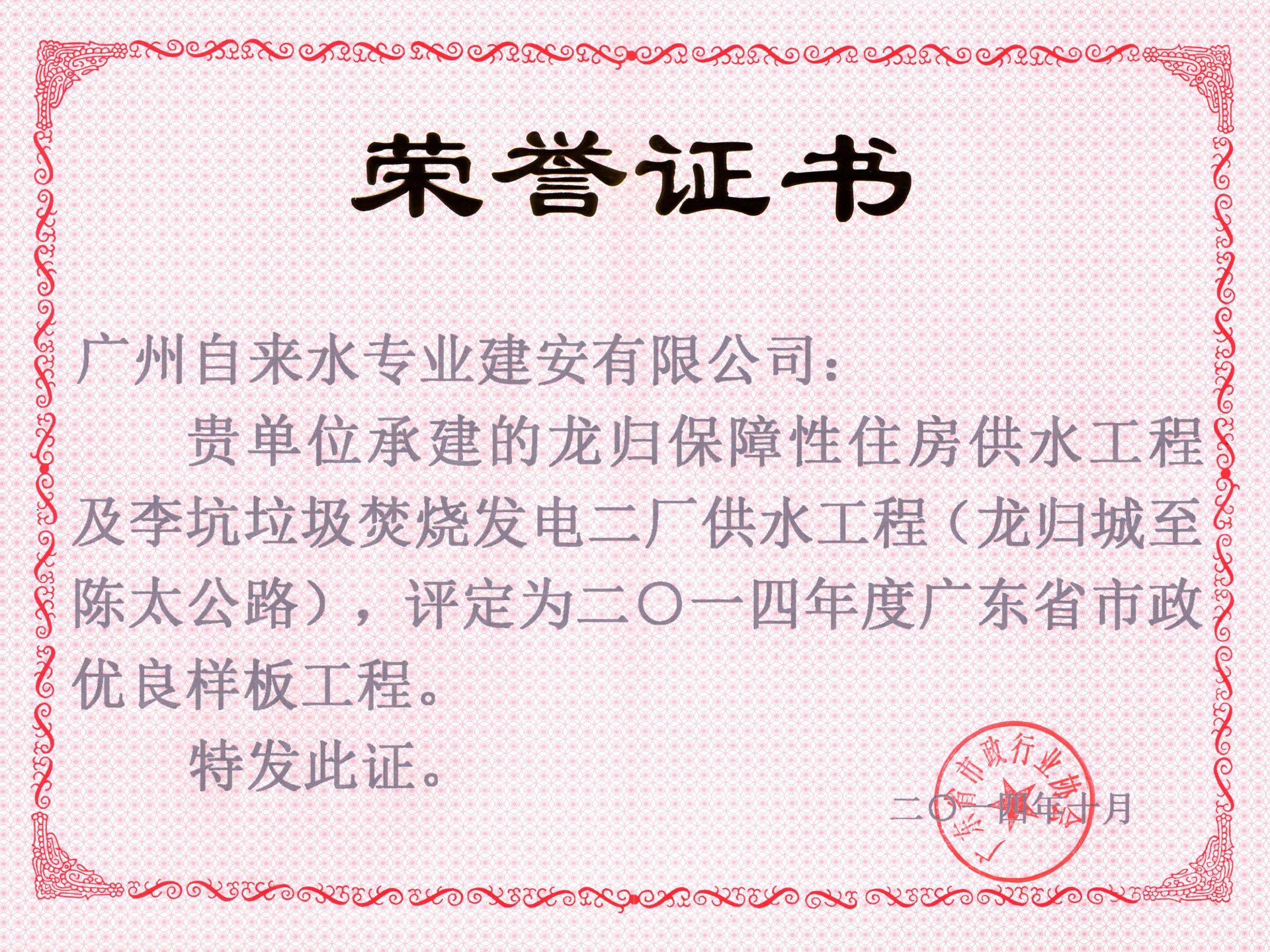 2014年度广东省优良样板工程-龙归保障性住房供水工程
