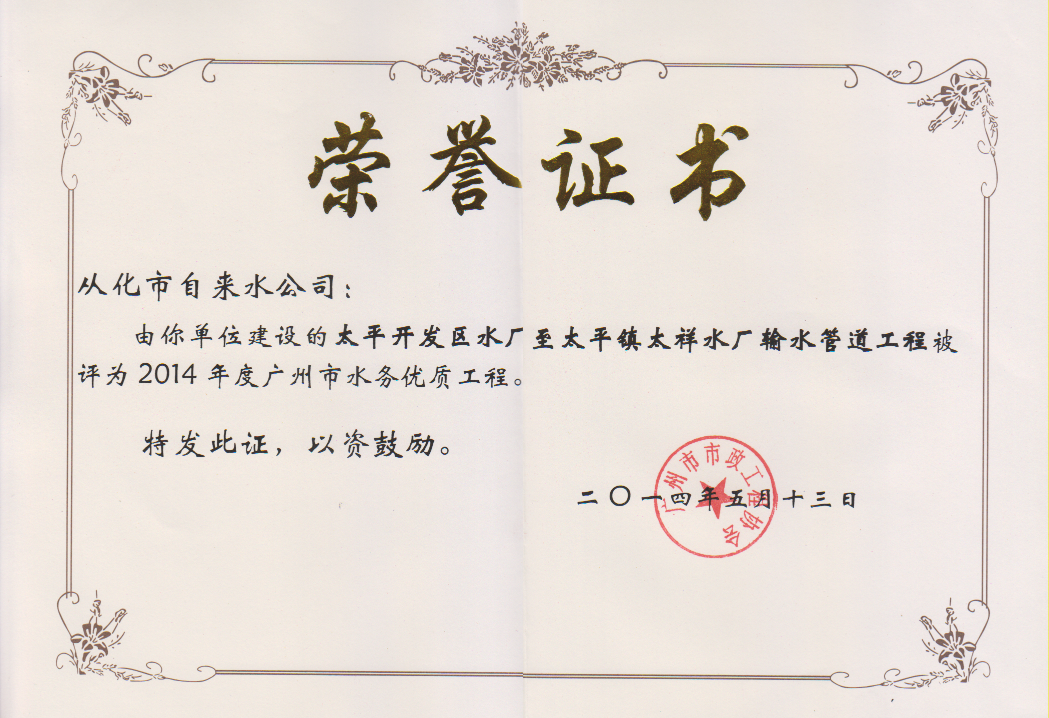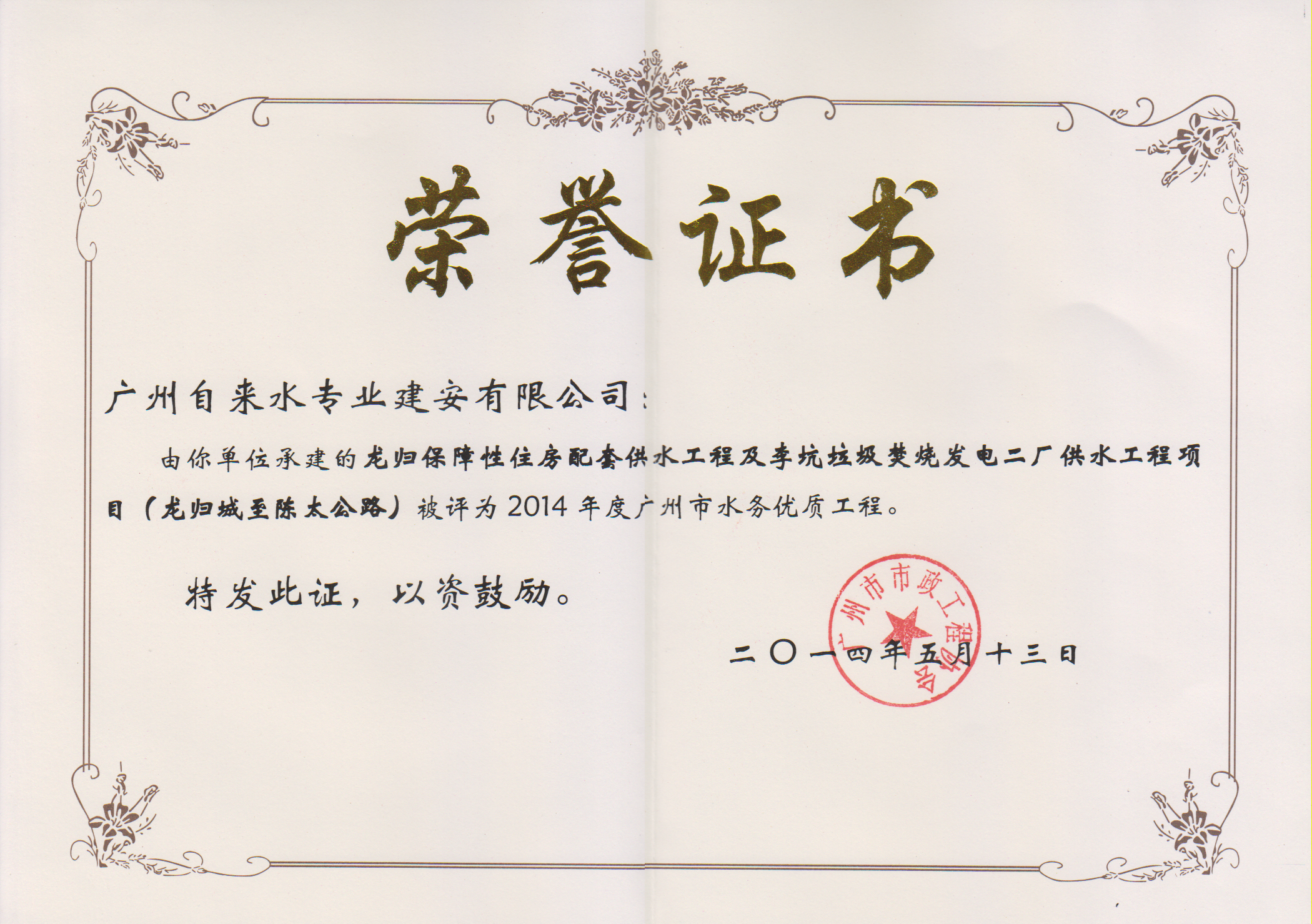 2014年度广州市水务优质工程龙归水务优质证书