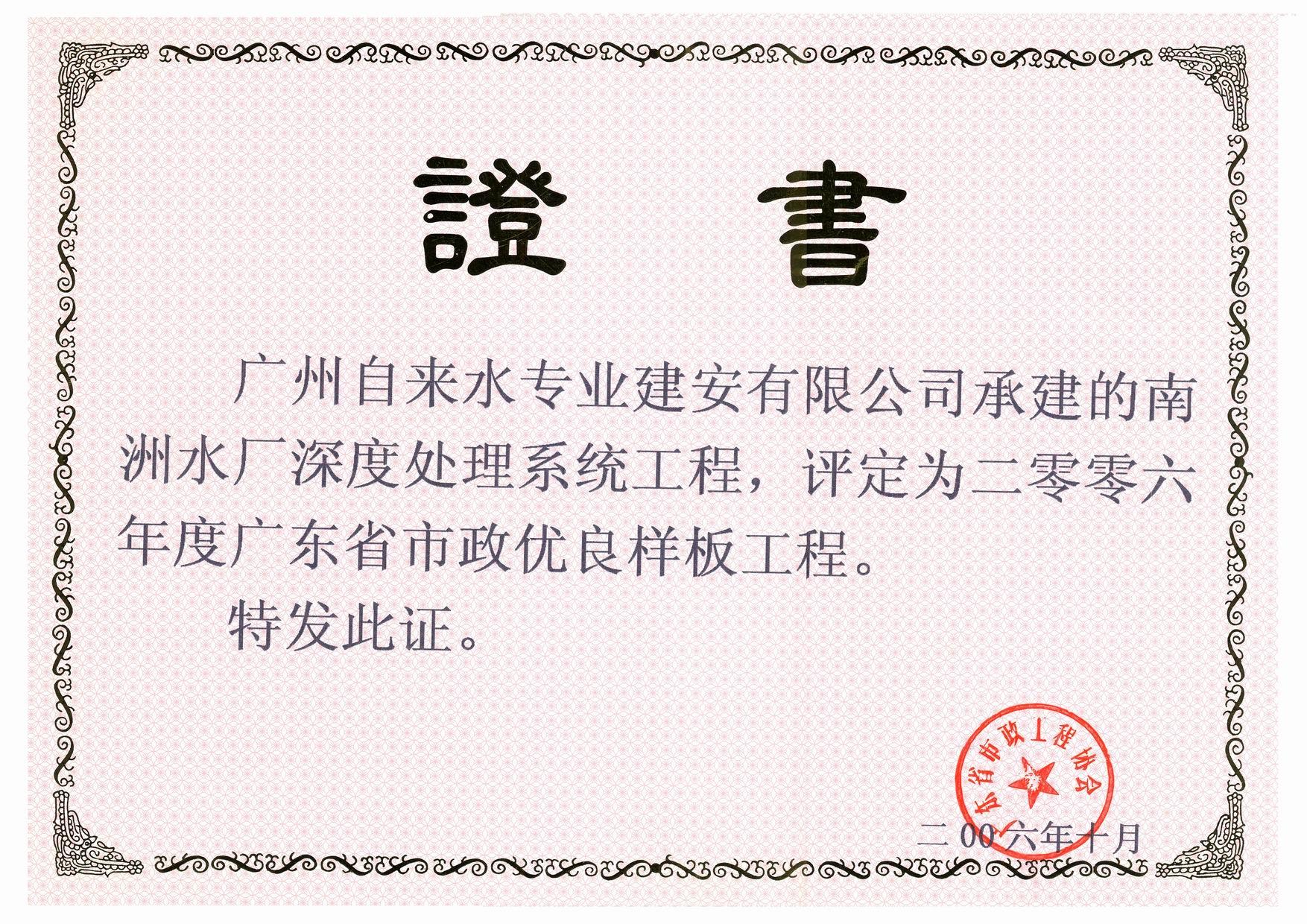 2006年度广东省市政优良样板工程-南洲水厂深度处理系统工程