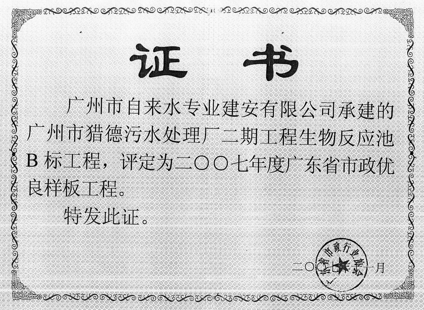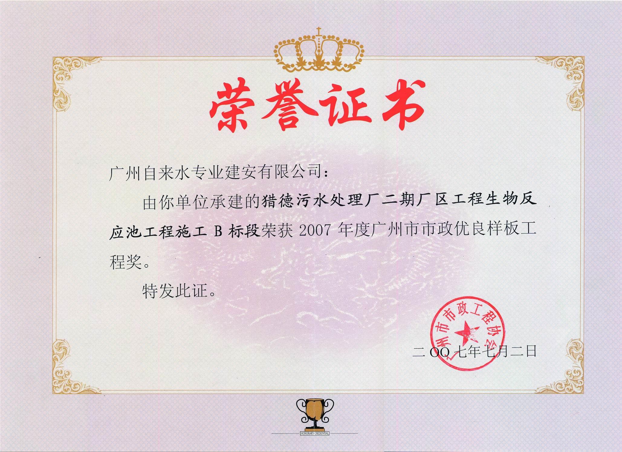 2007年度广州市市政优良样板工程-猎德污水处理厂二期
