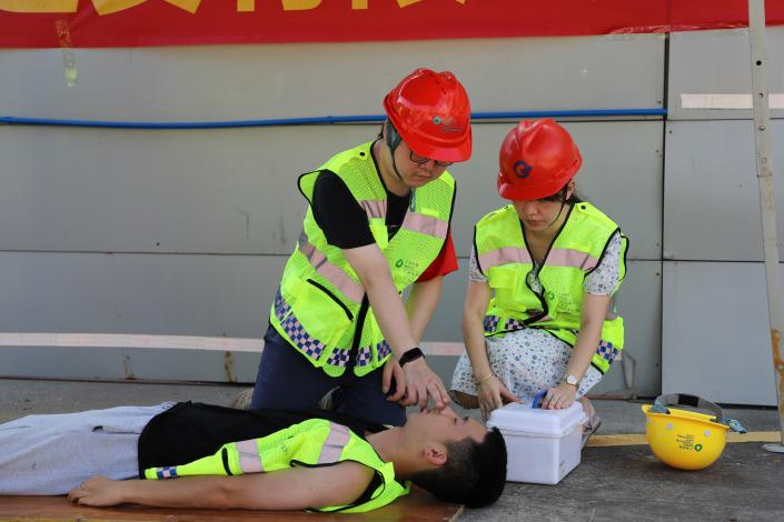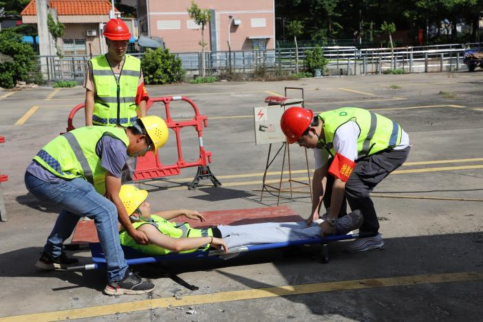 演练模拟现场作业人员在没有电工的配合下,私自接驳三级电箱用电,因天气炎热,将绝缘手套脱下进行作业,导致触电事故发生。作业人员因触电晕倒。现场管理人员发现工人晕倒后,即刻关闭三级电箱,并向上逐级汇报,启动III级应急响应,同时应急演练指挥部迅速开展应急抢险相关工作。